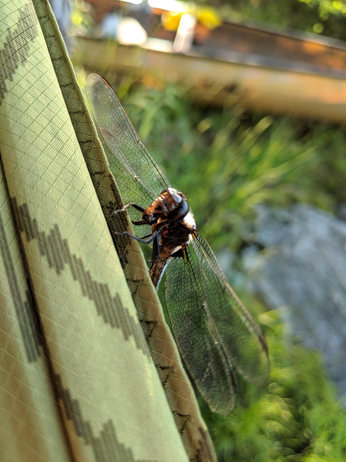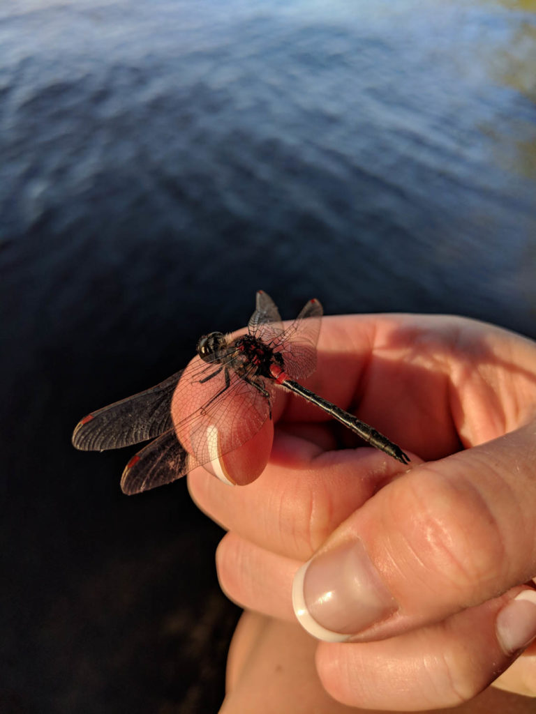 I even had a visitor, or two, while I was relaxing after swimming a bunch. These dragon flies were so calm while eating that I was able to get up really close and get pictures. Even managed to get one on my hand for a close up.