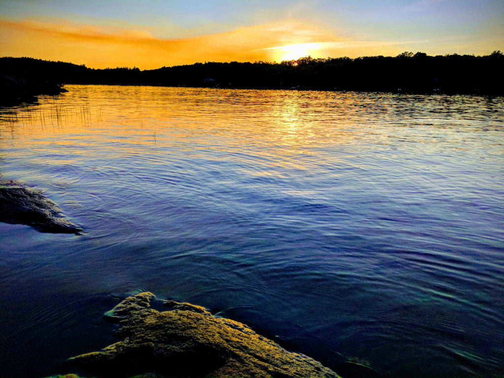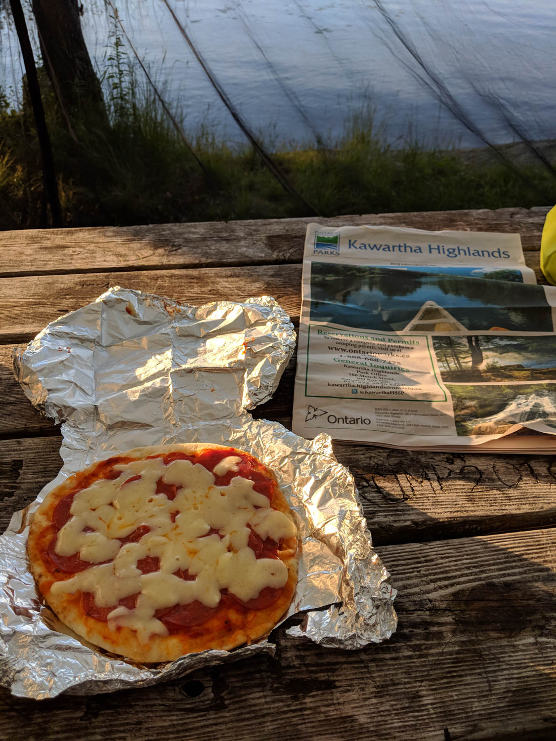 I settled in and also set up my hammock. I knew that after I went for a swim, I wanted to just relax and enjoy the evening. The swimming was wonderful! The water was so nice that I didn’t hesitate to jump right in. Unusual for me as I tend to wade in slowly. After my swim, I found it was still super warm. I made my supper (pizza on the fire), and went swimming yet again. I would actually go for a small swim, check on the fire, and repeat. It was the best way to stay cool.