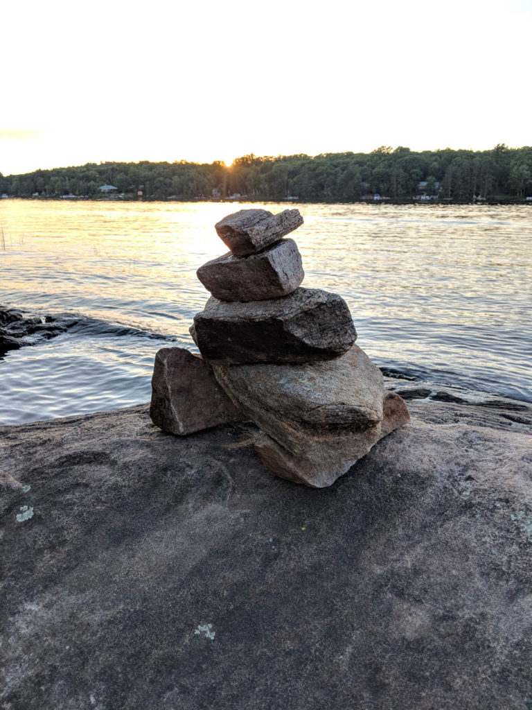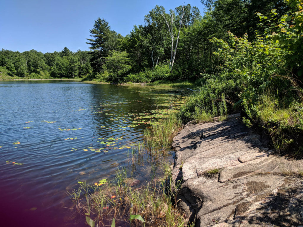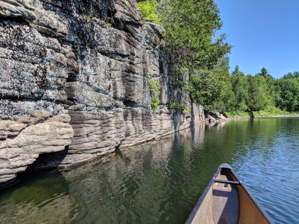 I had taken a paddle around this lake to check out the rock cliffs. They reminded me of canoeing at Puzzle Lake. I wondered if there were good spots to go cliff jumping, but being on my own this would not be a good choice. As I rounded the lake, the couple of loons that were occupying this space were very vocal. I didn’t realize until last minute that there was a baby close to me. It popped it head up above water for just enough time for me to capture it on video. Sorry loons, I will continue back to my site.