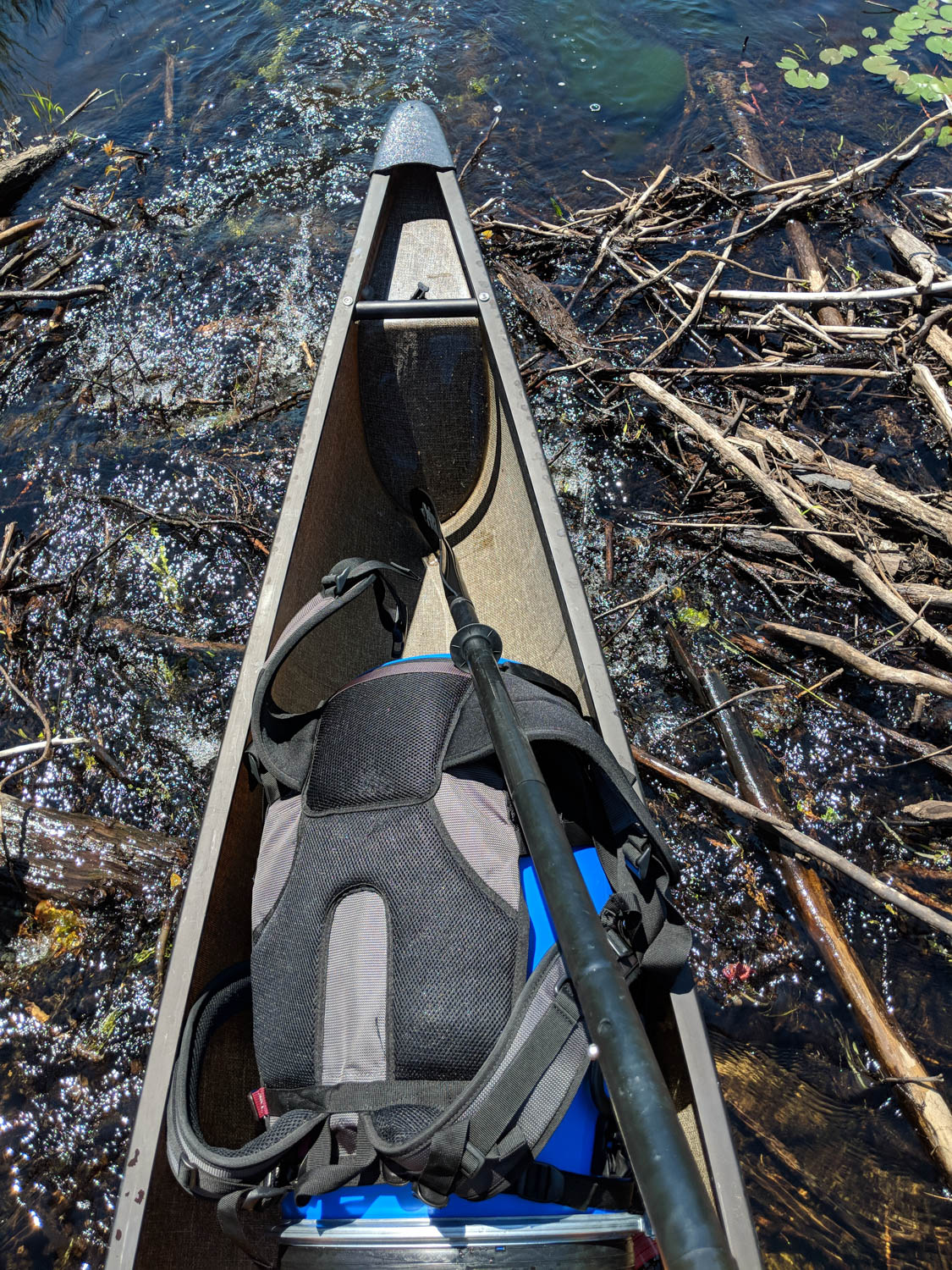 My first portage was coming up for this trip, and there were a few options. Two small portages, or in low water, one larger portage and one smaller portage. I didn’t know how low the water was, so I opted for the low water option. This was about a 500+ meter portage, and I could have gone with the short version. Next time! LOL. This was were the bad started. Portaging a solo canoe, with NO yoke, was not fun. I thought the seat would rest nicely on my shoulders, but no way. My head was touching the bottom of the canoe. It was hard on my head and the seat was slipping off my shoulder and neck from the sweat. I really need a removable yoke for this canoe! Any help with this??? anyone??