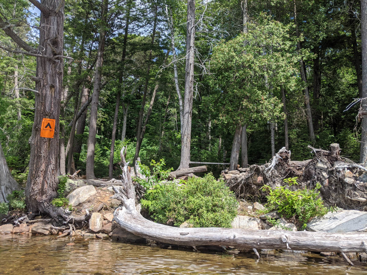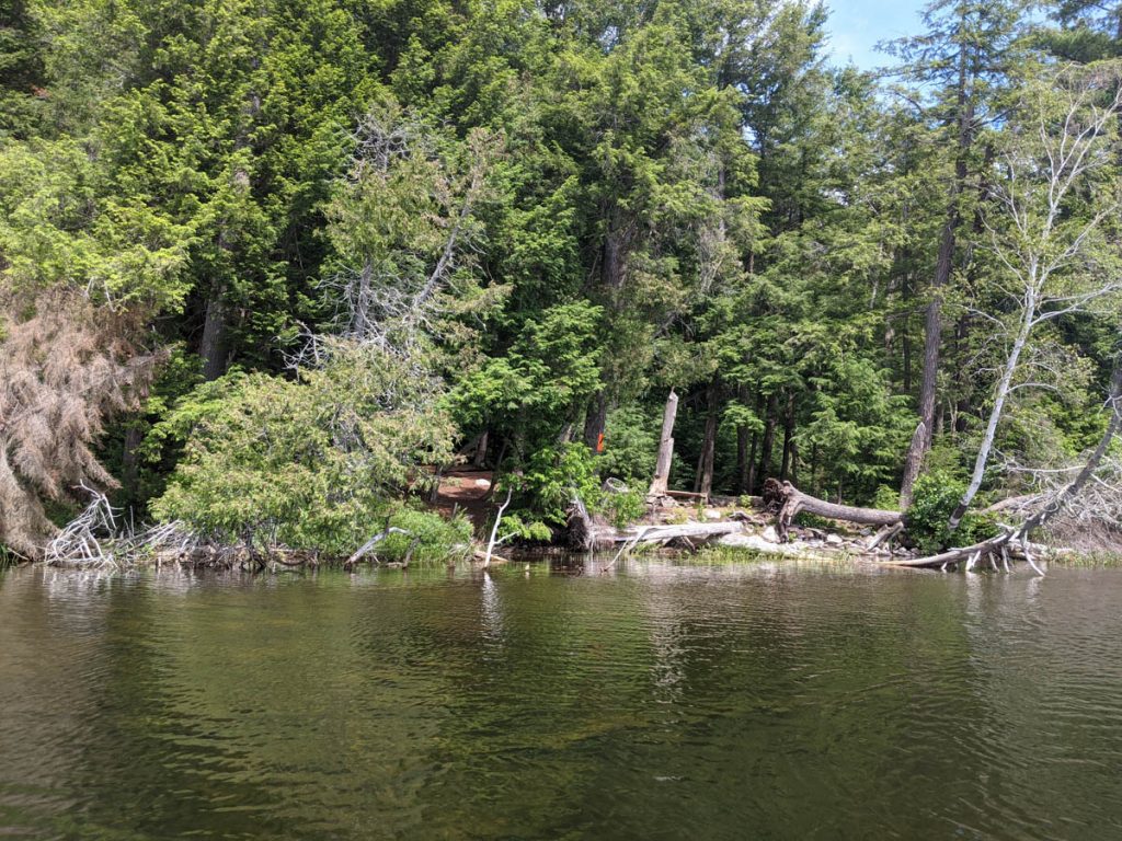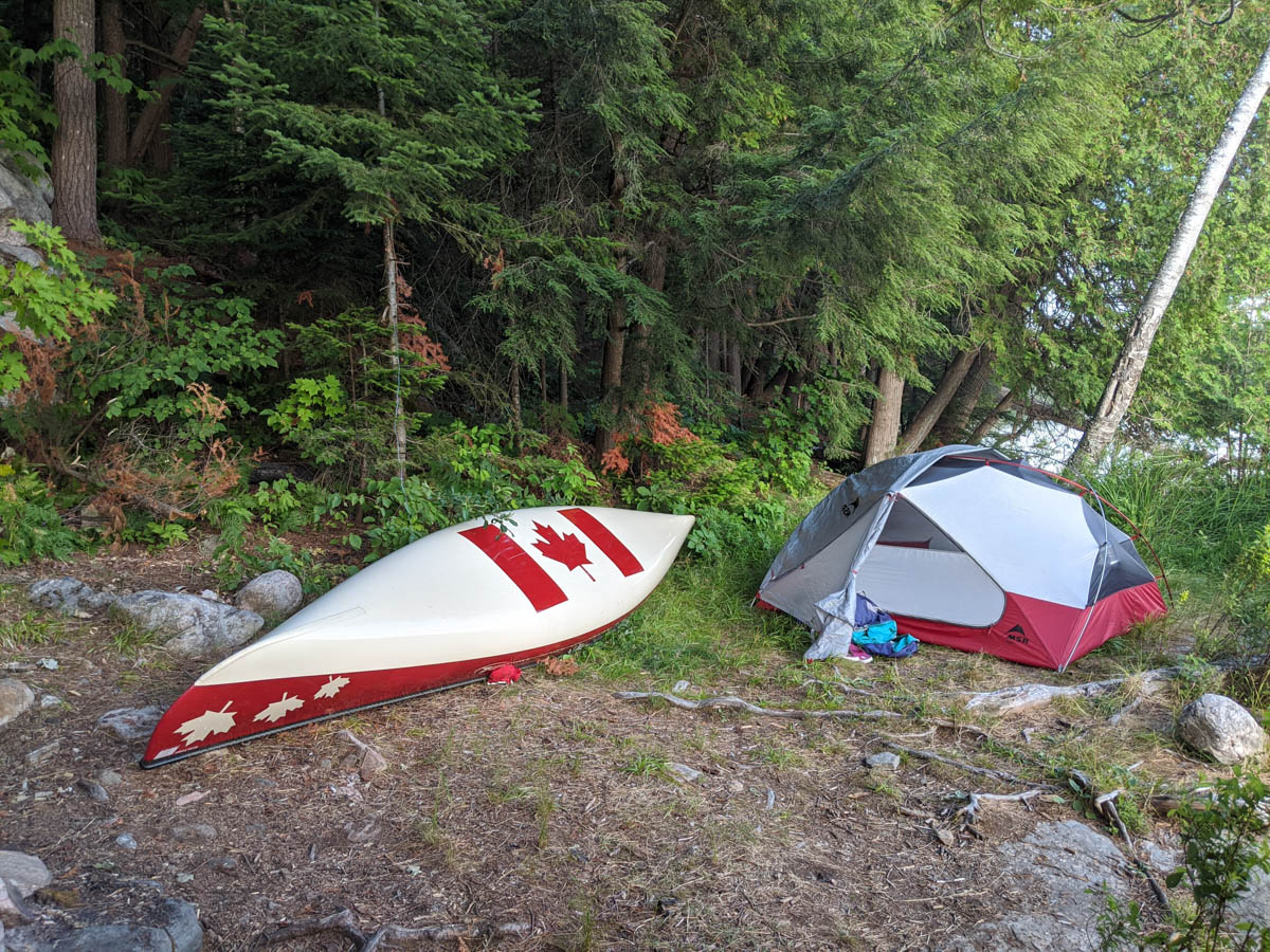 This is when we realized that this lake must have been hit by the wind and rain storms that had passed through in June because the first few smaller sites we found were littered with downed trees. We did find a bigger site, but it was located in a marshy section which is not the best for swimming and the next site was already occupied, so we continued on and eventually found our home for the night. The site was small and had just enough space for 1 small tent and a bug shelter, which really was just perfect for us.