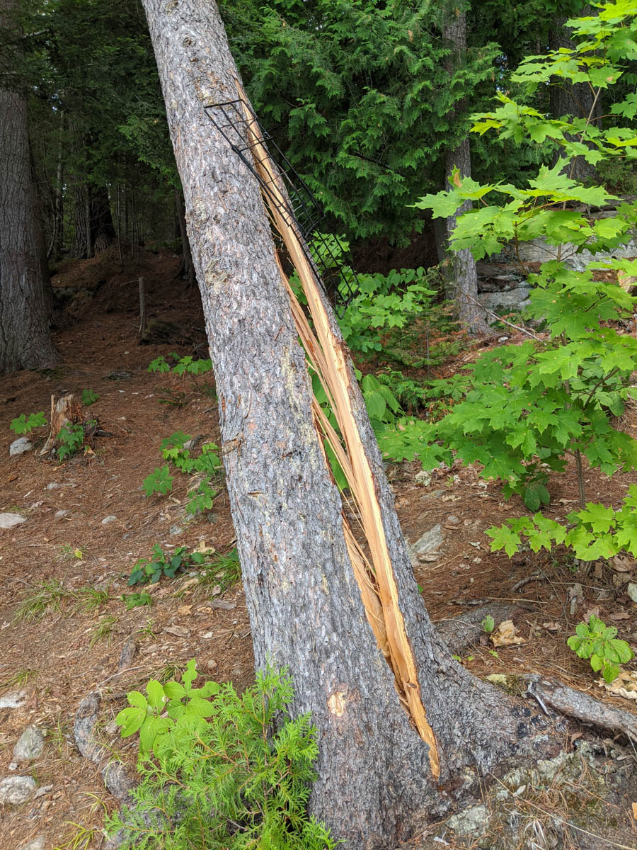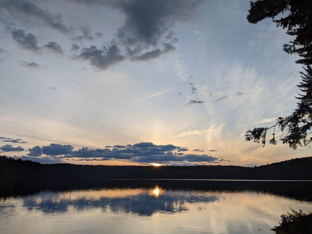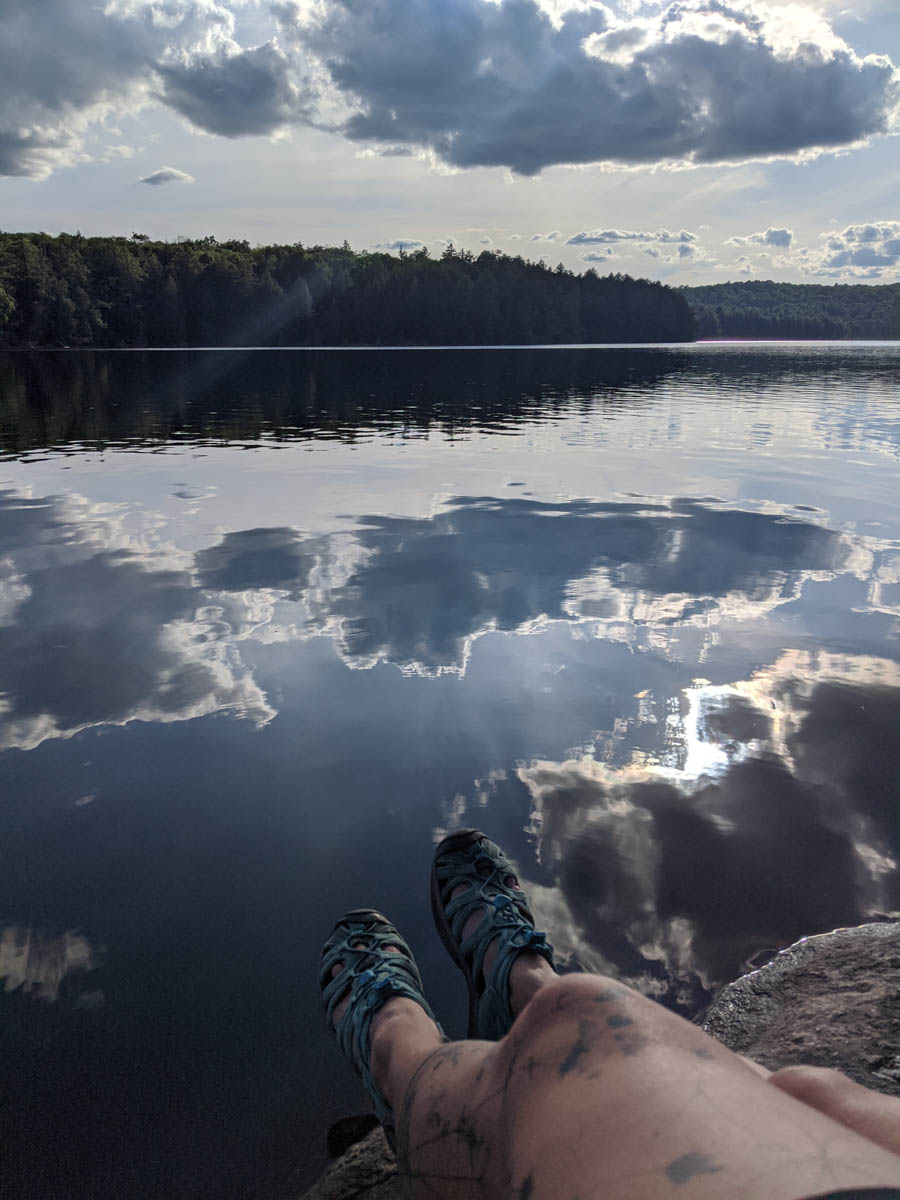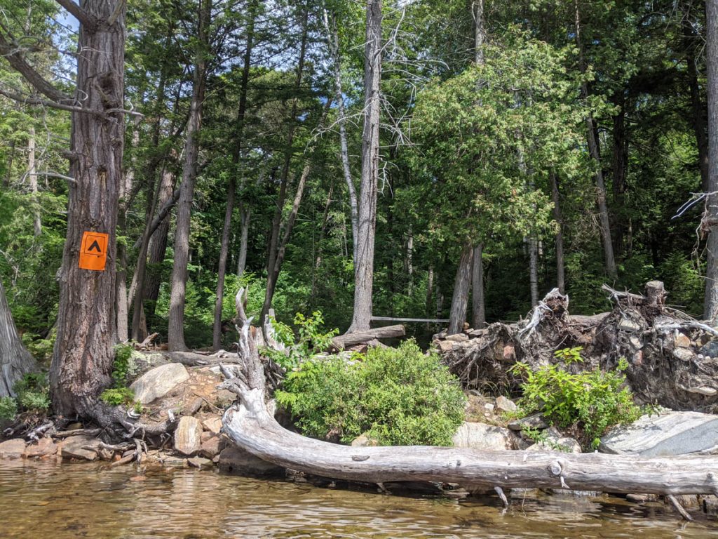 This is when we realized that this lake must have been hit by the wind and rain storms that had passed through in June because the first few smaller sites we found were littered with downed trees. We did find a bigger site, but it was located in a marshy section which is not the best for swimming and the next site was already occupied, so we continued on and eventually found our home for the night. The site was small and had just enough space for 1 small tent and a bug shelter, which really was just perfect for us.