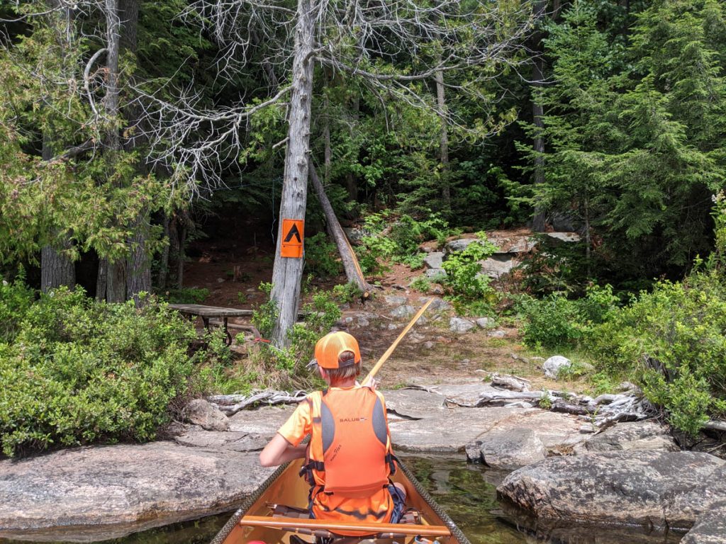 I made quick work of getting the canoe in the water with all our gear, plus the few extra items we took for fun, and headed out to find a campsite for our two nights. We started paddling to where I thought the narrows in the lake was located, but I soon realized we were heading the wrong way! Once our course was corrected we passed through the narrows and started searching the coastline for those beautiful orange camp signs. I was aiming for a particular area and wanted to find a site on the East side of the lake so that we would get the afternoon sun as well as a view of the sunset.