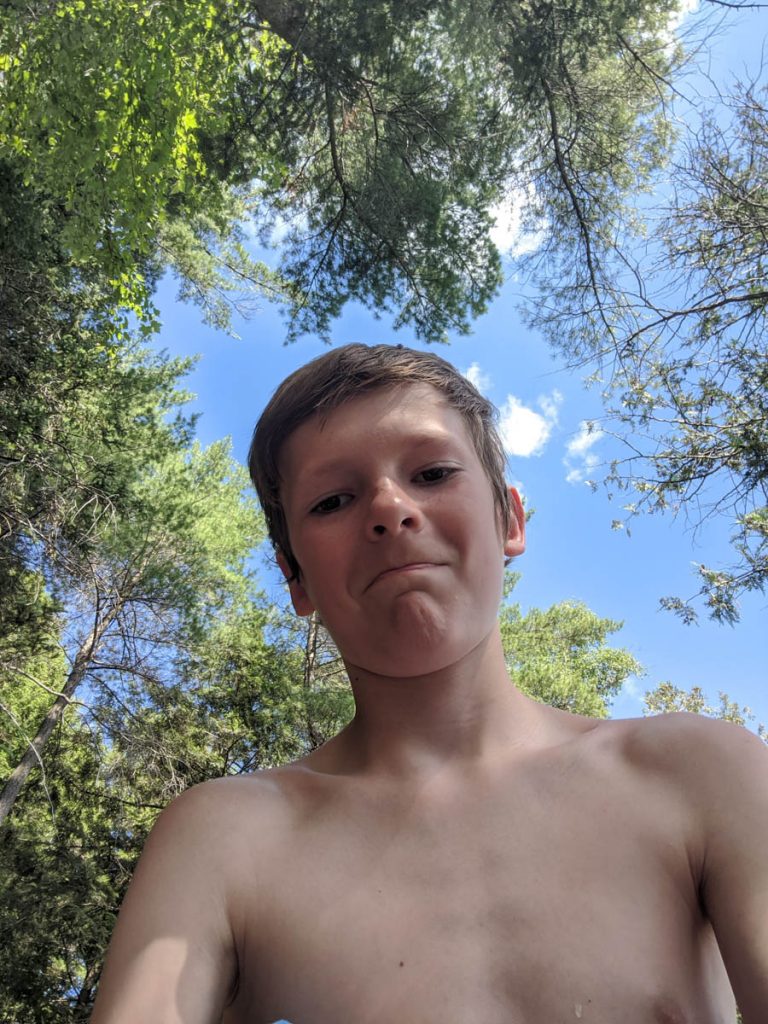 Once we landed we got started right away doing the camp chores. I am trying to get Hayden to do more around camp, so I got him to help set up the bug shelter, the tent, and to help organize his sleeping gear. He might complain a bit, but in the end he does a great job. When all the camp chores were complete we were ready to enjoy the water with our BIG floaties. We recently purchased these floaties at Costco and Hayden didn’t have to be asked twice to fill them up for our swim. I ended up tying them to the tree stump on the shore so that we could just hang out without getting blown down the lake. It also made for great games of “who can pull themselves quicker to shore” and “who can kick the rocks and push themselves out faster into the water”. I had asked Hayden to take a picture of me on the floaty, which resulted in him also taking a selfie. Funny kid.