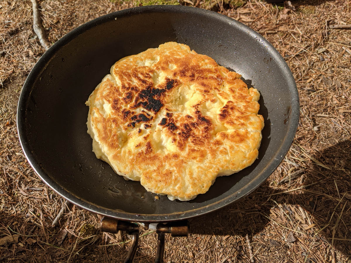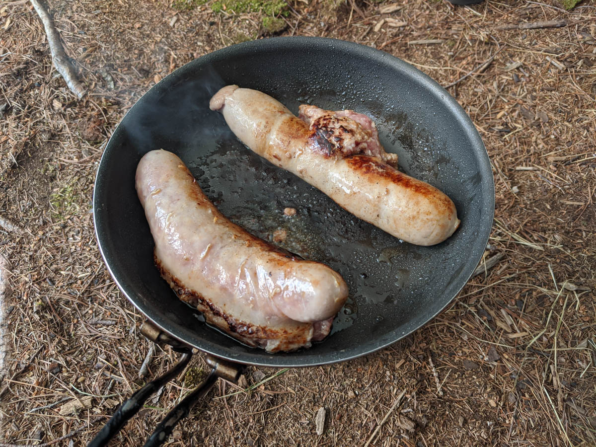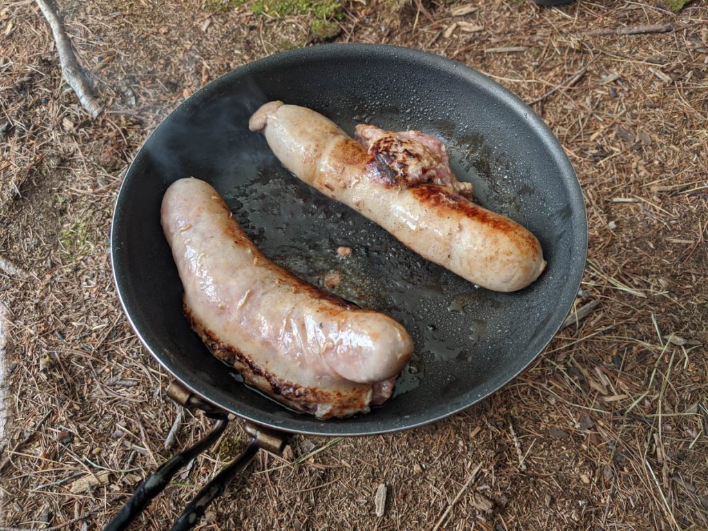 The water was so enjoyable that we could have stayed on the lake all afternoon and evening, but I had a hungry boy asking for supper. For supper we had fresh honey and garlic sausages from a local butcher with a side of bannock and mashed potatoes. The bannock was made from a Bisquick mix that I bought from a dollar store and I only used half a package for the two of us.