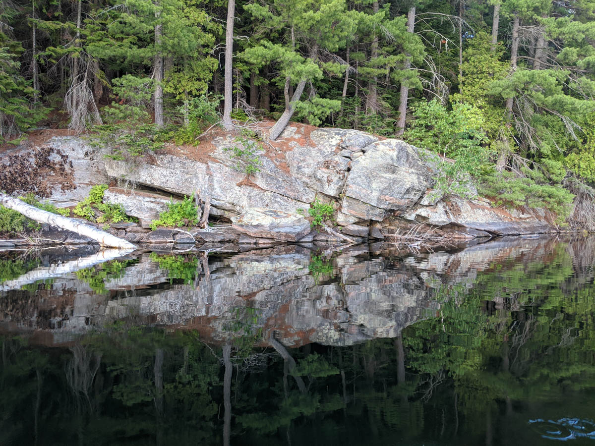 After supper I tried to do some fishing, but was unsuccessful, so I sat by the lake watching the beautiful sky slowly transition. The water was calm so we decided to head out for an evening paddle to check out the portage and the site at the north end of the lake. Well, this is where we should have camped. This site had a nice rock shoreline, plus two places to set up a tent. The only downside was the swimming was not as nice. No worries as we thought our site was the perfect location for us and the view of it from the water proved that.