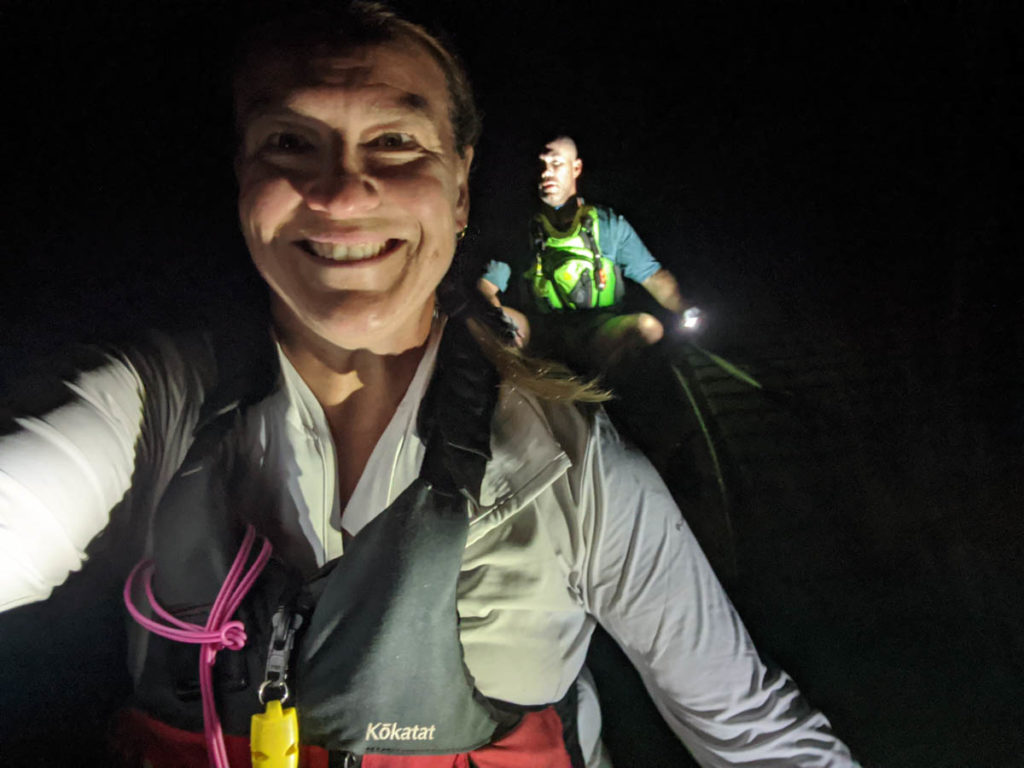 Having paddled this section of the river before a couple of times I was familiar with the route and gave directions while we used our headlamps to catch the shoreline for safe passage. The cooler air and warmer water created a mist above the river that blinded us in the direct light from our headlamps, so maneuvering the river was tricky, but we were successful.
